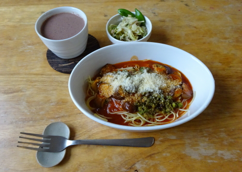 ・豆乳コーヒー ・キャベツと胡瓜のサラダ+スナップエンドウ ・パスタ: トマトソースには豚挽肉、玉葱、茄子、ふきのとう。 粉チーズ山盛りで。 今年もふきのとうをいただきました。 定番のふきのとう味噌よりも、 このパスタが好きです。 JUGEMテーマ:今日の朝ごはん
