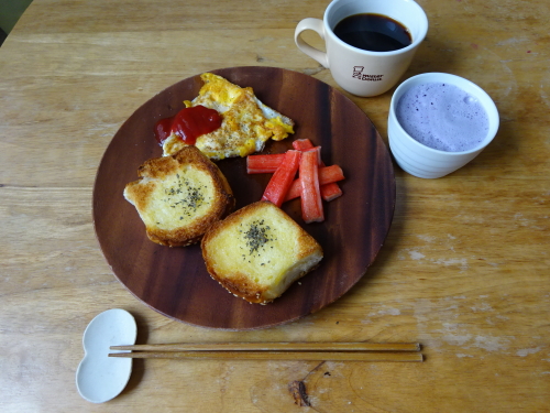 ・コーヒー ・スムージー: ブルーベリー、イチゴ ・目玉焼き(well-done) ・ちぎりパン+マーガリン+パセリ ・焼カニカマ JUGEMテーマ:今日の朝ごはん