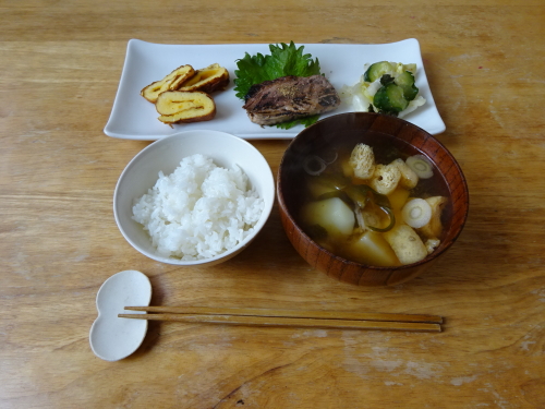・玉子焼き ・塩鯖(缶詰)+紫蘇(自家菜園) ・胡瓜とキャベツの浅漬け ・白米 ・味噌汁: じゃがいも、わかめ、油揚げ、長葱 JUGEMテーマ:今日の朝ごはん