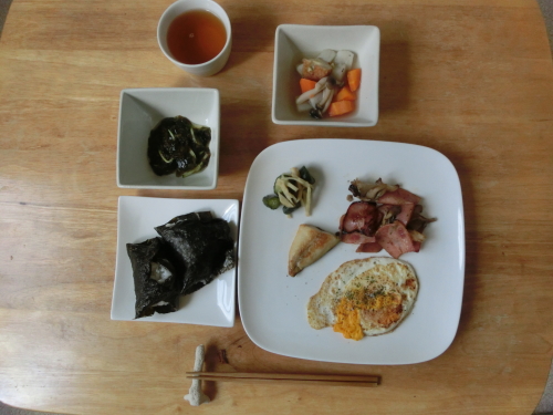 ・麦茶 ・煮物: 長芋、人参、竹輪、しめじ ・胡瓜ともずくの酢の物 ・おにぎり ・胡瓜の浅漬け ・ベーコンとしめじの油炒め ・ほっけ塩焼き ・目玉焼き JUGEMテーマ:今日の朝ごはん