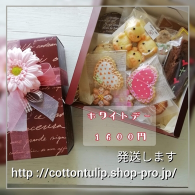 ホワイトデー ギフトボックス 1600円 http://cottontulip.shop-pro.jp/?pid=51044693 中身 ホワイトデー ギフトパック 640円 http://cottontulip.shop-pro.jp/?pid=157951890 いずれもご予算に応じで 中身の増減対応します。ご相談ください。 すてきなホワイトデーを。 ■■■■■■■■■■■■■■■■■■■■■■■■ ---------コットンチューリップお問合わせ先-------- 電話・FAX:01...