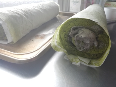 オーダーで焼いた 抹茶のロールケーキ。 クリームは黒ゴマ。 芯に栗の渋皮煮を仕込むのはオーダー品。 もう1本の補欠には 金時豆の甘納豆で、こちらは食事会のデザートに。 粉糖でハートの模様。 粉糖は、時間がたったら溶けて消えてしまうけど、 時間制限有りのハートマークも、 急いで帰って急いで急いでお披露目してね、の小さな主張。 金時豆とゴマクリームと抹茶のロールケーキ、...