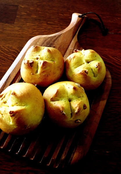 ●パン工房● 〈有名店のパンを真似て・・ターメリックと胡桃のパンにゃ♪〉 メゾンカイザーさんで購入のパン、ターメリックと胡桃の組み合わせにひとめぼれ♪ 想像の枠を超えませんが、そのお洒落な組み合わせで作ってみました、the真似っ子です(^^ もっともっと可愛い色で、香りもすごかった! 試行錯誤しながら、またトライしてみようと思います。 ターメリックと胡桃のパン(4個分)♪ 強力粉200g インスタントドライイースト3g ターメリックパウダー3g ...
