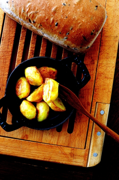 ●パン工房● 〈黒米入りのミニ食ワンローフと・・♪〉 一緒にオーブンに放り込んだじゃがいもさん♪ 長崎に帰った時は必ずゲットのじゃがいもさん、これが美味しくてハズレがない! 昨夜はチキンとセロリと放り込んで・・今日はパンと放り込み(^^ スキレットに並べオリーブオイルをかけるだけなローストポテト〜味付けしないのですが、美味し♪ おじゃがさんが気になり少しおざなり・・ごめんよ、愛しのワンローフ(^^ 黒米入りのミニ食パン(内寸180×85&tim...