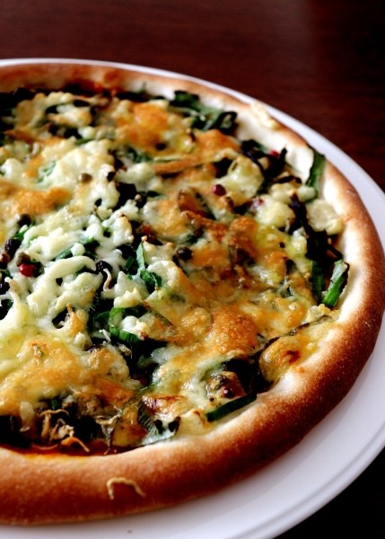 ●パン工房● 〈えごまの葉キムチのソース・・しらす遊ぶピザ&にゃ♪〉 今年最後かなぁピザ♪ カルディで一番人気?えごまの葉キムチをゲットしたので、自家製えごま葉キムチの消費を兼ねて、 刻んでコチュジャンを足して、マヨネーズとえごまオイルいっぱいのソース。 具材はネギとしらす、実山椒にカラフルペパーに2種の溶けるチーズ、至極シンプル・・シンプル過ぎたかな。 お昼過ぎから雪が凄い!吹雪いてます。 全国的な寒波らしいですね、凄いことになってます、...