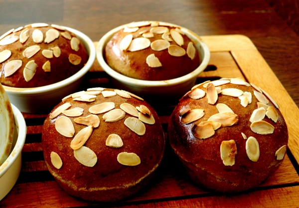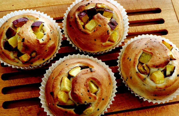 ●パン工房● 〈おこげ寸前!さつま芋のパン&さんざん・・にゃ♪〉 ちょっと前に頂いた立派な鬼柚子(珍しいの、有難う^^)、皮は白菜漬けや酢の物、 果肉は絞って、鶏すきのつゆに、さつまいもの甘煮と、使い切り!ほっつ♪ ゆず香るさつまいもの甘煮でくるくるパン。 黒ごま入りで、砂糖の量をいつもより多め・・すっかり忘れ!おこげ寸前の初焼きです(^^。 ごま入りさつま芋のパン(底面直径7~8センチカップ・4個分)♪ 強力粉160g インスタントドライイース...
