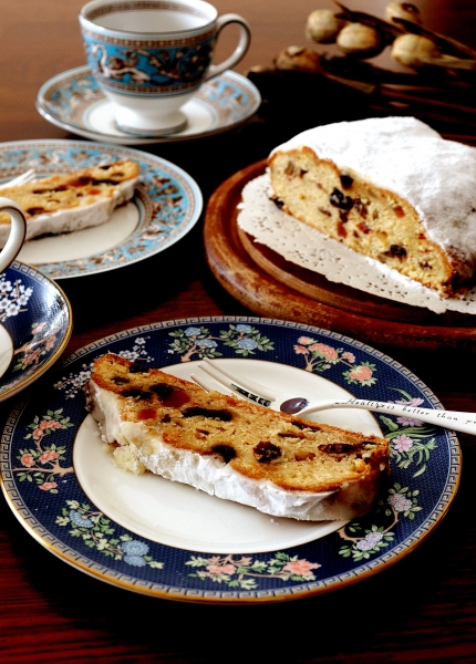 ●パン工房● 〈今年も・・シュトレンでティータイムにゃ♪〉 土曜日にと思いながら、1日長く熟成の今年のシュトレン♪ ラップを外し粉糖をさらに上からふり、おめかしな雪景色。 「どう?美味しい?どんな感じ?」まだ食べてないってね、せかす急かす(^^。 「うん、美味しい」・・あぁ良かった良かったぁ、美味しいひと言で幸せ気分満載♪♪ と、強制嫁入りなシュトレンも美味しくできますように、神様お願い。 フルーツをもうちょっと増やしても良いかなぁ、くるみ...