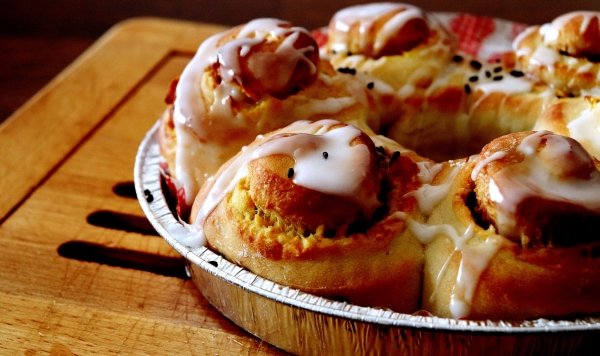 ●パン工房● 〈さつまいものリングパン♪〉 ハッピーハロウィン♪ 立派に成長すぎの大人2人の我が家。 今夜はちびちびお酒(私はワインですが^^)を飲みながら、大鍋で煮込んだおでんでパーティー♪ 相棒殿は今日仕事で外まわりだそうなので、あったかいものがおご馳走というわけ(^^。 下ごしらえの合間に、手土産用のリングパンこさえました。 さつまいものリングパン(直径20センチ1台分)♪ 強力粉180g インスタントドライイースト2g 砂糖10g 塩2g ...