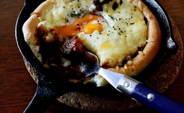 ●パン工房● 〈とろりん玉子とカレーのスキレットパン&にゃ♪〉 オリーブオイル多め、フランスパン粉50g、1次発酵だけでふわふわ生地。 すじ肉とまるごとじゃがいものカレーの残りと、玉子、溶けるチーズトッピング♪ 半熟玉子好きにはたまりません♪ 粉50gってベーグル1個と同じ量。 ベーグルは1個では物足りなく、2個食べて、目が詰まってるから後からどかっとだけど、 トッピングいっぱいだからかな? 1個でお腹いっぱい。 とろとろ半熟玉子を割って、スキレ...