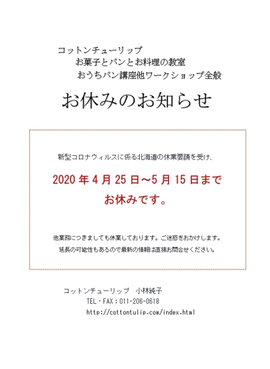 レッスンとかワークショップとか、 スイーツ会とか食事会とか期日までお休みです。 みんなに会えなくて寂しいです。 パンを焼いたりお菓子を作ったり、 ご飯を食べたり、 みんなが集まって元気になれる場所として作った コットンチューリップのリビング。 早くまた大きな口開けて食べて 大声で笑える日が来ますように。 わたしは発送のお菓子を焼いたり、 ネコやカラスを観察したり写真を撮ったり、 申請書類作ったり、 ゆるい中にも時折忙し...