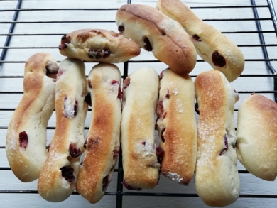今朝のパン。 クランベリーのスティックパン。 きのうは一日パソコンに向かっていたせいか すごく甘〜いものが食べたくて夕方仕込んだ クランベリー入りのパン生地は、 ベーカーズパーセントで言うところの10%、ラカントSを入れている。 そしてドライクランベリーは30%。 まだ発酵が終わっていないであろう昨夜遅くに我慢できなくて 半分焼いて試食。 甘い!! 甘いのだが、クランベリーの酸味が心地よくて しばらくするとまた...