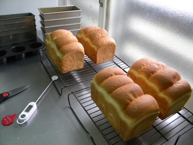 手前、苺の自家培養酵母と白神こだま酵母の食パン 向う、珈琲の自家培養酵母と白神こだま酵母の食パン いずれも1斤サイズ(断面が、一般的な食パン12センチ角より小さめの10センチ角) ひとつ430円(税込) なんとなぁくイチゴやコーヒーの香りと色がして、 ふかふかで適度な重さがあって、 コットンチューリップ人気のパンです。 工房直売の「コットン日和」で販売、またはご予約にて承ります。 一度にた...