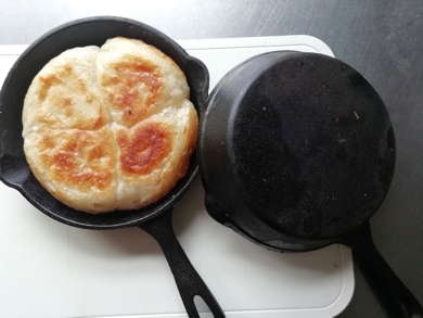 百円ショップのダイソーで買った300円商品スキレットを 2枚使うと、 オーブンが無くてもパンが焼けますよ。 1枚にパン生地を置き、 もう1枚は蓋として使います。 ガスの火が側面を伝わって上部にも回り 側面にも焼き色が付きます。 もちろんこのままじゃ、上が焼けないので 途中、ひっくり返して 今度は蓋の部分にパンがのるように、 今まで鍋だったスキレットが蓋になります。 大きなフライパンで小さな丸いパンを何個も焼くと ...