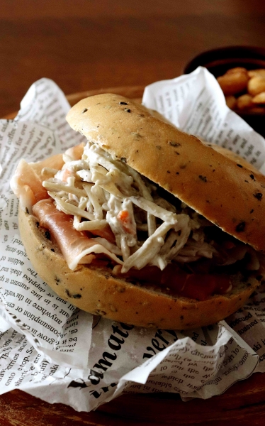 ●パン工房● 〈胡麻のソフトベーグル・・サンドイッチにゃ♪〉 今日は朝から雨、午後から上がるそうですが、部屋の中はちょっと肌寒い。 ニットのカーディガンを羽織りうろうろ。 煖房をいれようかどうか迷う所、つかの間、パン焼きのオーブンの周りで暖を(^^ そんな日のパンはベーグル、胡麻をいっぱい入れました♪ 胡麻ベーグル(2個分)♪ 強力粉(ゆめちから)100g インスタントドライイースト1g きび糖3g 塩2g 無塩バター3g 水52g 水とバター以外...