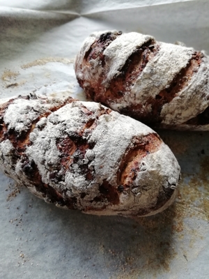 雑穀は、 粉砕小麦、粉砕ライ麦、小麦ふすま、粉砕大豆、アマニ、粉砕小麦麦芽、粉砕ライ麦サワー種、焙焼ライ麦粉、焙焼小麦粉、大豆粉、食塩、香辛料 そしてたっくさんのレーズンとクルミ、 もう生地に混ざりきらないんじゃないかと思うくらい、 生地のベースは北海道産はるゆたかブレンド、 そこに塩と水と、 白神こだま酵母。 レーズンがたーーっくさん入ったせいか、 粉たちの持つ風味なのか、 噛みしめると豊かな甘みに、 「甘...