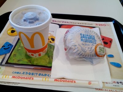 27日まで、マクドナルドの新アイスコーヒーが無料らしいので久々に朝マックしてきました。 コーヒー無料は、朝7時から10時までです。 マクドのバーガーを写真に撮ると、どう写しても絶対に綺麗にならないので、包みのままで失礼します。 店頭の宣材写真見るたびに、プロの"匠の技"に感心しきりな私です。 ソーセージグリドル単品(¥150)とアイスコーヒー(¥0)。 マックグリドル好きなんですが、大人女子が朝からこれをセットで食べるのは胃に厳しい。...