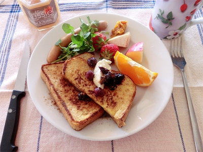 JUGEMテーマ:今日の朝ご飯 おはようございます。 今日は、日差しが気持ちの良い朝 雨の中休みを思う存分楽しみましょう! っという事で、本日の朝ごはんは、こんな↓感じで。 シナモンフレンチトーストにキャラメルメープルをたっぷり 掛けたちょっと甘めの朝ごはん。 コーヒーは、深煎りのスイートフレンチローストをチョイス! ミルクを注いでカフェラテにしても美味しいです。 それでは、楽しい1日をお過ごし下さい
