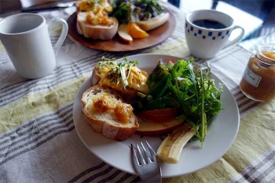 JUGEMテーマ:今日の朝ご飯 おはようございます。 今朝は、有機野菜のサラダ w/ヨーグルトドレッシング、 さつまいもの伊予柑煮と発酵バターを塗ったバゲットをカリッと 焼いてとろとろスクランブルエッグをトッピング。 そして、今朝のもうひとつのお楽しみは、トーストしたバゲットに ゴーダチーズとハウスサンアントンの黄金桃ジャムをたっぷりのっけて sa ku ra ブレンドと一緒に・・・ 野沢温泉でひと際目を惹くオシャレなお...
