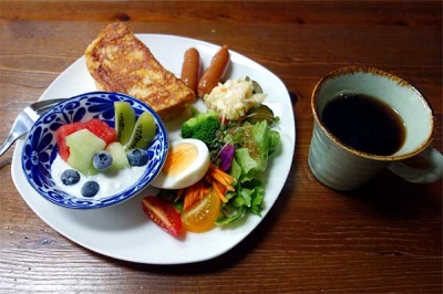 おはようございます。 今日は、朝どれ野菜のサラダとブルーベリーのヨーグルト、 フレンチトーストとブラジル・ブルボン が朝ごはん。 ツヤッツヤの夏野菜