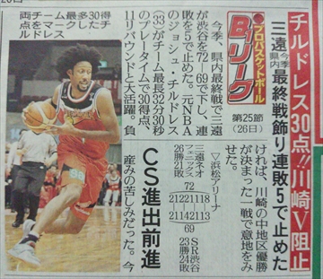 JUGEMテーマ:三遠ネオフェニックス こんばんは・・・・・。 スポーツ報知・静岡版にも 昨日の試合の記事が掲載されていましたね! 2日間、大活躍だったチルドレス選手の カラー写真も載ってますね〜!! 怪我から復帰して、いきなりのこの大活躍! 素晴らしいですね〜。 記事の最後には ドジャー選手の再来日予定の事も 書かれていてビックリでした。 公式発表が待ち遠しいですね。 ・ [スポナビ動画] 3/26 B1 三遠 vs. SR渋谷 ハイライト https://t.co/sTSvwsPdaB &mdas...