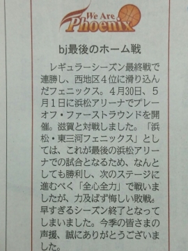 JUGEMテーマ:bjリーグ 浜松・東三河フェニックス プレイオフ1stラウンド@浜松アリーナ、 みなさん、2日間お疲れさまでした。 善戦及ばず、フェニックスは連敗となってしまいましたが 自分的にはもうやれる事は全部やれたかな? という思いです。 浜松・東三河フェニックス オフィシャルページ http://bj-phoenix.com/ 浜松・東三河フェニックス Facebook https://www.facebook.com/bjPhoenixOfficial Facebook 浜松・東三河フェニックスブースターページ http://www.facebook.com/p...
