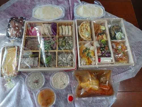 今年はおせち料理をいつもお世話になっているジェファンさんにお願いしました。 きなこ豚のテリーヌ 仏産鴨のスパイス焼き おき農園大根のピクルス ハーブ鶏砂ズリのコンフィ A4黒毛和牛ローストビーフ 桜島鶏と白石レンコンのガランティーヌ 桜島鶏ハムのサラダ テットドフロマージュ トリュフチーズ ホタテとカリフラワーのマリネ ズワイガニのキッシュ オマール海老とキャビア キングサーモンのマリネ クスクスサラダ アワビの香草バター オマール海老のドリア しかやさん...