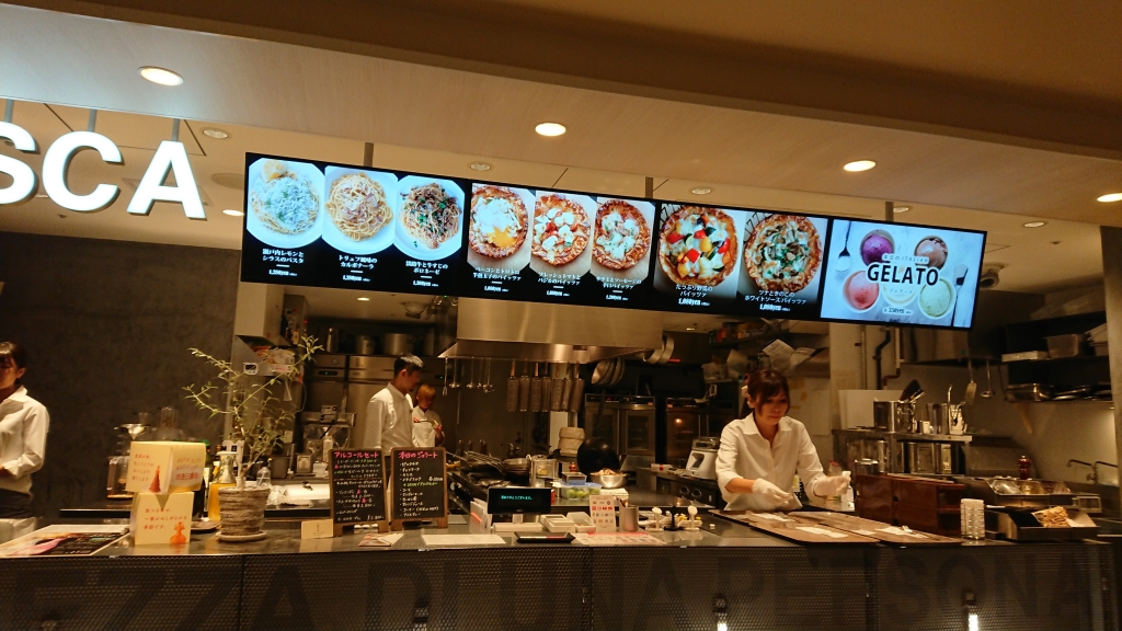 ■Italian Dining PESCA(イタリアン ダイニング ペスカ) 2018年3月に阪急三番街の北館地下2階が大リニューアルしてフードコートスタイルの飲食エリアに行って来ました。リニューアルは知っていましたが利用したのはこれが初めて。 『UMEDA FOOD HALL』は総席数1000席もある巨大なフードコート。土曜日の夕方利用でしたが、かなり席は埋まっているものの、席待ちがでているほどではなかったです。 フードコートには18店舗ものお店が並び、お寿司、味噌カツ、うどん、イタリアン、フレンチ、ステーキ...