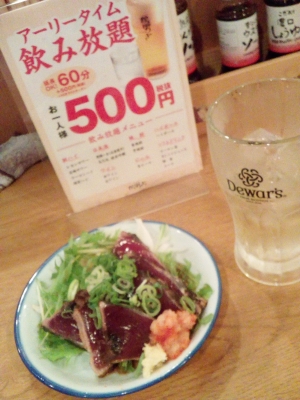 センターホテルO阪の1かいに テナントではいっている フジオフードシステムちゃんが運営ちている かっぽうぎで でなーちてきますた! アーリータイムは飲み放題で 60分500えんだよー! と、ゆーことでぇー デュワーズハイボール 4はいと ウーロン茶を のんできますた! おしはらいはー? あっ!? 馬株主優待犬もっていくの忘れてたぁー!...