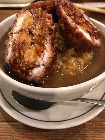 以前書いた「寄席に行って参りました」>の時にお腹が空き過ぎて寄席を抜けたと書きました。 その際に入ったお店が「王ろじ」さん。 末廣亭も古い建物だったので、なんとなく昔情緒を欲していたのでしょう。 お腹も空いていたのでガッツリ食べたいこともあり、「とんかつ」「カレー」はぴったりでした。 そこで注文したのがこちらの「とん丼」 カレーの上にとんかつが乗って、その上からさらにソースがかけてあります。 まずは上のカレーをガ...