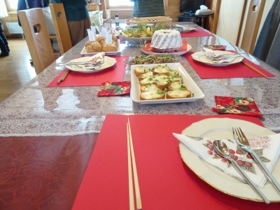 JUGEMテーマ:紅茶・コーヒーを楽しむ* 3年ぶりのポットラック(持ち寄り)クリスマスパーティーの テーブルセッティング中。 持ち寄られたお料理は どれもこれも美味しくておなかも気持ちも大満足になりました。 ケーキ担当の私は クリスマスクグロフと イチゴソースのせパンナコッタ、どちらもクリスマスカラーを意識 して作ってみました。 ポットラックパー...