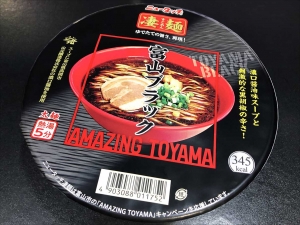 今日も朝から雨で全体が濡れ少し寒い、@おざさです。 ということで。 今日のお昼は・・・ 「ニュータッチ凄麺富山ブラック」です。 富山の「山元醸造株式会社」さんの濃口醤油を使っているとのこと。 こういうコラボ、多分地元の味に近くなっていると思うので嬉しいです。 中身は液体スープ・スパイス・かやく(チャーシュー・ネギ・めんま)が入っています。 麺は黄色い凄麺の、透明感のある中華麺ぽい感じです。 煮干出汁も入っているということで削り粉・うま味調味料少々、 にんにくを少々...