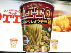 今日も晴れ、この天気が続くそうです、@おざさです。 ということで。 今日のお昼は・・・ 「マルちゃん 裏Qtta(クッタ)」です。 ロゴが反対になっています。 フタを開けた瞬間「こんがりしょうゆ味」の香ばしい香りが漂い、 いただく前から期待感が膨らみます。 中身は粉末スープ・かやく(肉・ネギ・海老・たまご)が入っています。 麺は細く少し黄色ぽい感じです。 にんにくペースト・うま味調味料を少々いれて熱湯3分、 グレープシードオイルをかけていただきます。 いやぁ「こんが...