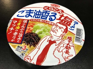 梅雨じゃないみたいに暑い、@おざさです。 ということで。 今日のお昼は・・・ 「サンヨーごま油香る塩ラーメン」です。 塩こん部長のイラストがインパクト大! 自宅に塩こん部長が居たので事務所に出向してもらいました(笑)。 中身は液体スープ・かやく(くらこん・人参)が入っています。 直にキャベツが入っています。麺はサッポロ一番の麺ぽい感じです。 にんにく・うま味調味料を少々、乾燥野菜を入れて熱湯3分、 生ネギ・梅干し・エビ、そして自宅にあった「くらこん塩こんぶ」...