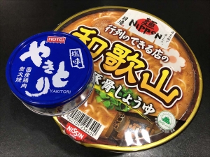 外に出るとほんとに夏になってきたなぁと感じる@おざさです。 ということで。 今日のお昼は・・・ 「日清行列のできる店の和歌山特濃豚骨しょうゆ」です。 これに「ホテイのやきとり塩味」を贅沢にトッピングします。 このトッピングは、カップ麺に入れる最高で贅沢なうちの一つです(自分調べw)。 中身は液体スープ・粉末スープ(とろみをつけるもの?)・ かやく(チャーシュー・ネギ・めんま・かまぼこ)が入っています。 麺はモッチリ美味しい中太麺です。 先にやきとりの缶詰を熱湯...