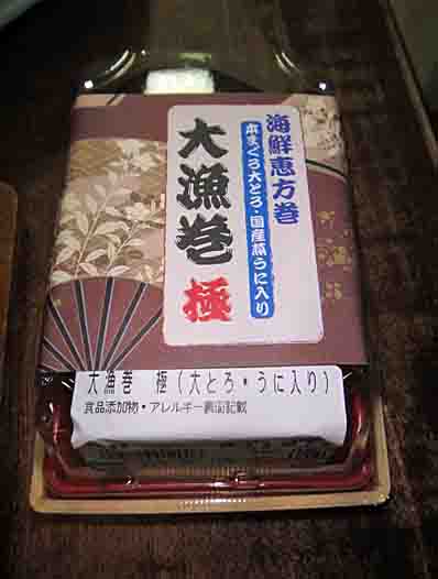 JUGEMテーマ:たっ・・・食べたいっ!! 午後、JR三鷹駅近くの商業施設に、恵方巻を買いに行きました。 今日は本まぐろ大トロ、国産蒸ウニ入りの「海鮮恵方巻・大漁巻 極」と「エビフライ&ロースとんかつ巻」をチョイス。 海鮮巻の方は、ハーフサイズなのに、1,800円もして思わず、 高っ!! Σ Σ('Д`lll) !!
