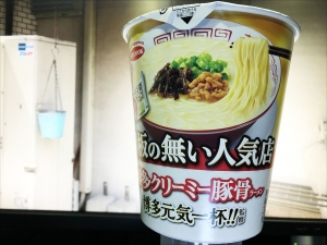 ちょっと雲がありますが概ね晴れな@おざさです。 ということで。 今日のお昼は・・・ 「エースコック 看板の無い人気店 博多元気一杯」です。 「博多元気一杯さん監修」です。 お店には看板がなく、青いバケツが掛かっている時が オープンしているという印だそうです。 写真の左側ね。 粉スープ・きくらげ・大豆加工肉・ネギ、別袋で液体スープが入っています。 このカップ麺は一度食べたことがありましたので今回は思い切り味変です。 熱湯3分弱で液体スープ・グレープシードオイ...