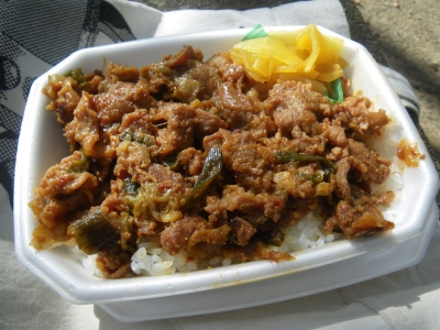 JUGEMテーマ:テイクアウト やきにく弁当500円。 このお店についてのネット上の文言から、このメニューを注文。すぐ渡されたので、人気メニューでもあり、つくり置いているみたいだ。 「あれ、けっこう小さいな」と思う。確か「ボリュームある」とか書かれてなかったっけ。 蓋を開いてみて「うわっ、そういうことか」と思った。きわめてシンプルです。 肉はタレに漬け置いたもの。ところどころに見える深緑のものは、高菜かニラかどっちだろう。タレがいいぐあいにご飯にしみ込んでいます。 食べてみたらけっこうお腹いっぱい...