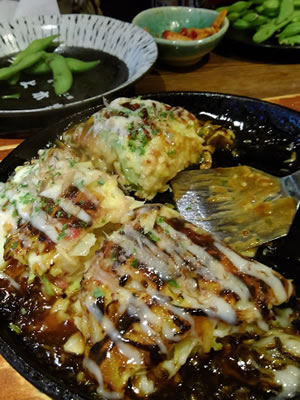 JUGEMテーマ:たこ焼き 日曜のテコンドーの後は、恒例の上木屋でたこ焼き反省会?! ビール片手に、まぁ、大人の反省会ってところでしょうか(笑) たこ焼きだけではなく、お好み焼きも美味しいです! スタンダードなイカ天と、豚玉にチーズとカレーをトッピング! チーズとカレーをトッピング?・・・って思ったんですが、結構イケてます! ただし、かなり濃いぃ〜です!白飯が欲しくなるって感じかな(苦笑)
