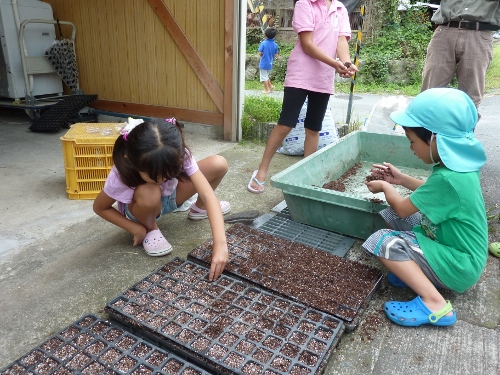 前日までの豪雨がうそのようにピタッとやみました。 センターに奉職して20年近くになりますが、通常、真夏の援農にはどこの産地でも、会員さんの参加があまりなかった記憶がありますが、今日は5家族20名近くも来てくれてとても感激しました。 小さい子どもが多いので、午前中で切り上げるべく、朝早くからがんばりました。白菜のポットへの種まきです。 大豆畑が草ぼうぼうだったので、タッキー&テッチー&ムギオ氏で刈り払い機で草刈り。終わったら熊手で刈った草の回収。 今回お貸し頂いたヨージさんちの刈り払...