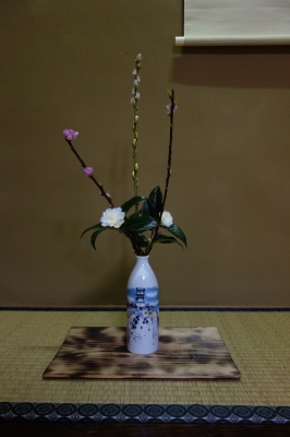 JUGEMテーマ:お茶 昨日の煎茶サークル。 床の間に桃の花。 徳利を花入に見立てて。 春まだ遠からじ。 酒徳利に、椿、金目柳、桃の花。 お酒を携えてお花見に〜♪外は吹雪ナリ〜! 今冬は庭の椿に助けられました。 雪国のハンディキャップ…。来シーズンも、ちょっと実験したいことができました。 う〜ん、茶花ってオモシロイ! 本日は『常楽我吃』陳健一書。 食べるの大好きなるりさんにピッタリよ。