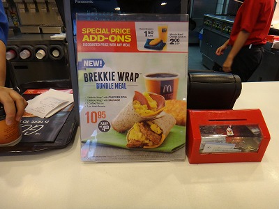 マレーシアの朝マックで新メニューBREKKIE WRAPを試してみた。 朝マックメニューのマックラップで、Brekkie Wrap SausageとBrekkie Wrap Chiken Rollの2種類ある。 ブレッキーラップソーセージのセットを注文してみた。 セットで8.8RM(税込み)日本円で約290円くらい 包装の中はこんな感じ。 トルティーヤにチーズとスクランブルエッグとソーセージがまかれている。 イスラム圏なので、ソーセージはチキンソーセージである。 つづいて、チキンロールのほうはソーセージのかわりにチキンのハムが入っている...