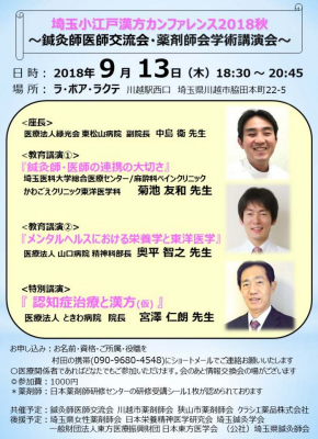 JUGEMテーマ:食事・栄養療法 JUGEMテーマ:鍼灸・漢方・東洋医学 埼玉小江戸漢方カンファレンス2018 〜鍼灸師医師交流会・薬剤師会学術講演会〜 ★医療関係者であればどなたでもご参加いただけます。会のあとに情報交換の場がございます。 日 時: 2018年9月13日(木)18:30 〜 20:45 場 所: ラ・ボア・ラクテ 川越駅西口 埼玉県川越市脇田本町22-5 〜 プログラム 〜 <座長> 医療法人緑光会 東松山病院 副院長 中島 衛 先生 &...