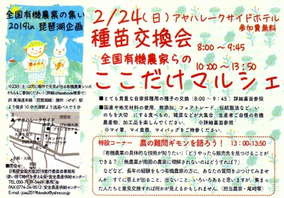 △▼△▽△▽△▽△▽△▽△▽△▽△▽△▽△▽△▽△▽△▼△▽ ♪ 全国有機農家らのここだけマルシェ ♪ = 全国有機農業の集い2019 in 琵琶湖 = 2019年2月24日(日) @滋賀県大津市 琵琶湖畔 ▽△▼△▽△▽△▽△▽△▽△▽△▽△▽△▽△▽△▽△▽△▼△ 国産や地元材料の使用、無添加、フェアトレード、伝統製法などいのちを大切にする食べもの、 雑貨などが大集合。 どなたでも自由にご参加いただけます。2/24のランチはぜひこちらで! 生産者ご自慢の有機農産物や加工品を、作り手とのコミュケーションとともに...