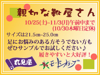 2014年 第14弾 親切な靴屋さん 10月25日(土)〜11月3日(月)午前中まで ※10月30日 木曜日は定休 展示期間靴もあります! ●サイズは21.5cm〜25.0cm ●外反母趾・巻き爪・胛高・幅広など ●当日はサンプルでお試しいただき出来上がりまで約3週間お待ちいただきます。 ●痛いところのお直しは無料サービス ●歩き心地はフカフカで気持ちいい♪ ご購入者様からも『履きやすい』・『歩きやすい』とご好評頂いております。 足にお悩みのある方・そうでない方も是非サンプルでお試...