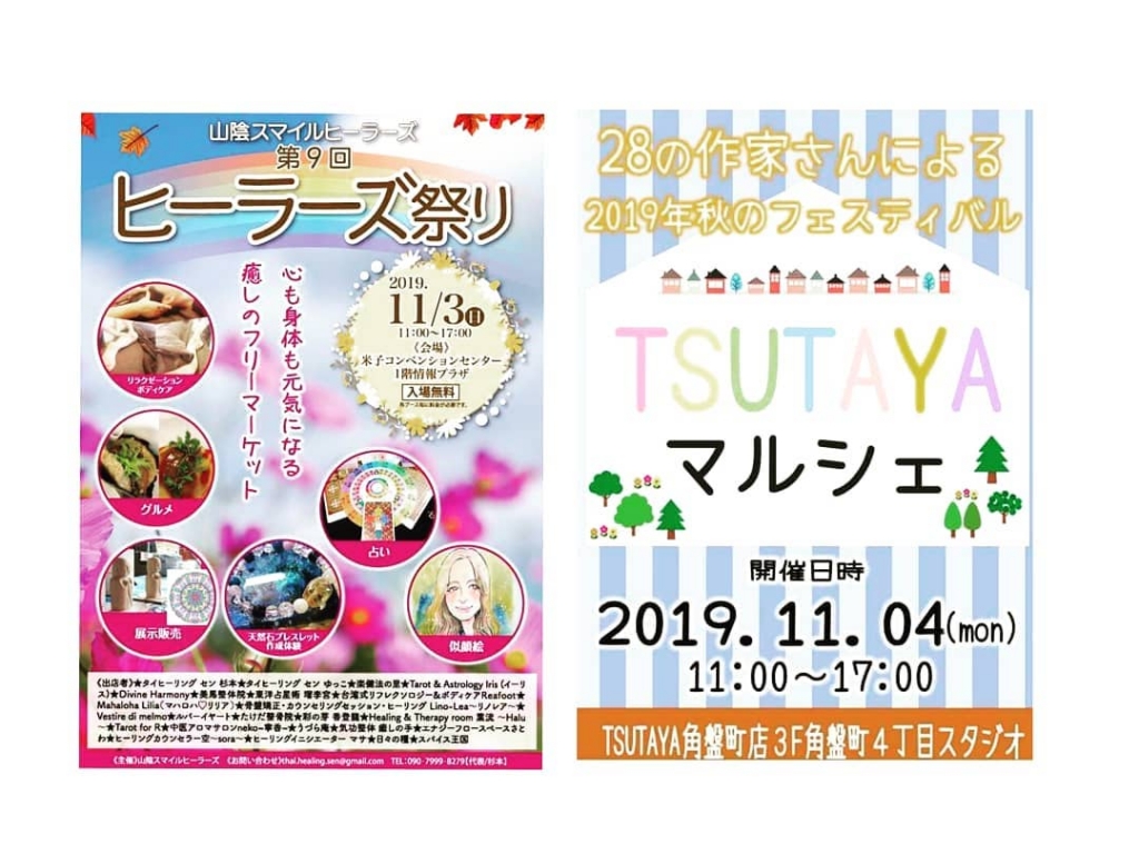 明日、明後日はイベントが続きます。 山陰のオーラソーマティーチャーゆりりんです(*^-^*) 11/3(日)ヒーラーズ祭り 米子コンベンション 第9回目とあって、ベテランヒーラーさんが集います!! 私は4年ぶりの出展、楽しみです。 11/4(月・祝)TSUTAYAマルシェ 米子角盤町店 今年の春に続いて秋バージョン!! 手作り作家さんが28名、ワークショップもあります。 お時間は、どちらも11〜17時です。 事前にご予約も出来ますので、希望のお時間...