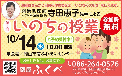 こんにちは店長です今年もやります、いのちの授業この企画は福岡県で『めぐみ助産院』を開業されている助産師の寺田恵子先生をお招きして当店が毎年開催しているものです(テレビや新聞でもお馴染みの全国的に著名な、あの寺田先生です例年わたしの母校である福浜幼稚園や『福浜小学校』で催していましたが今回はなんと外へ飛び出してオープン講座を開いちゃいます中身は寺田先生のいのちの授業&わたしの食育講座のダブル講演という形をとるつもりです岡山でいのちの授業を体験できるまたとないチャンスですよ今からスケジュー...