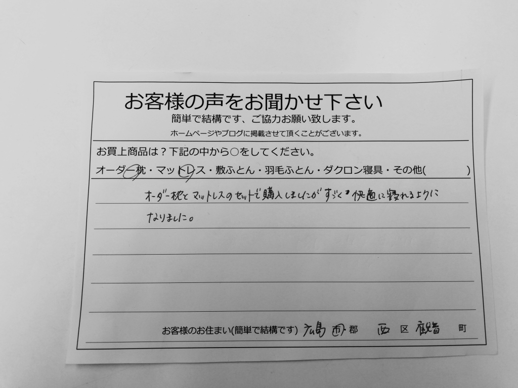 JUGEMテーマ:オーダーメイド枕 いつもかわの寝具青崎店のブログを見ていただきありがとうございます。 最近の傾向として オーダー枕を作りに来られるお客さまのなかには 睡眠をより良くしたい という理由でオーダー枕を作りに来られたり、マットレスや羽毛ふとんを買いに来られる方が増えてきました。 睡眠が大事ということが浸透してきているようです。 さて。 オーダーメイド枕の調整に来られたお客さまの声を頂戴いたしましたので 一部、ご紹介...