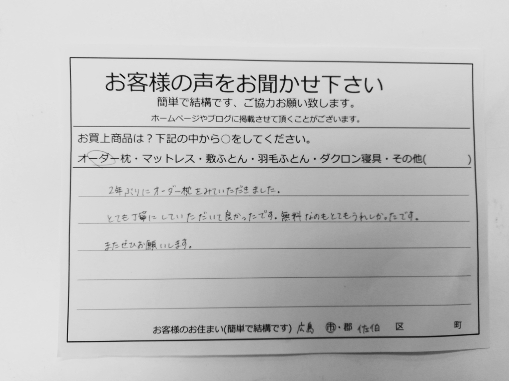 JUGEMテーマ:オーダーメイド枕 いつもかわの寝具青崎店のブログを見ていただきありがとうございます。 かわの寝具青崎店には、毎日のように 様々な睡眠の悩みをもった方、 様々な睡眠環境の方が来られます。 それぞれ、からだのつくりや疲れや お使いの敷き布団など 違いますから それぞれに合った高さにお作りしております。 さて。 広島市佐伯区からオーダーメイド枕の調整に来られました。 ...