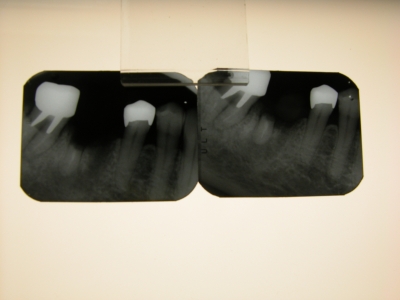 JUGEMテーマ:歯の健康 このレントゲン写真は、二つあった歯根の右側を抜去して、左側を一時的に わざと残した例です。 左側のレントゲン写真は抜いたときのもの。 右側のレントゲン写真は、4ヵ月後のもの。 右側のレントゲン写真では、残した歯根は浮き上がってきています。 そして、その右側の、先に抜いた部分の凹みが緩やかになったのがわかるでしょうか。 歯根をのこして、置くことにより周囲の骨の回復を助けることになるのです。 この方法は、前歯部分でも応用できます。 ...