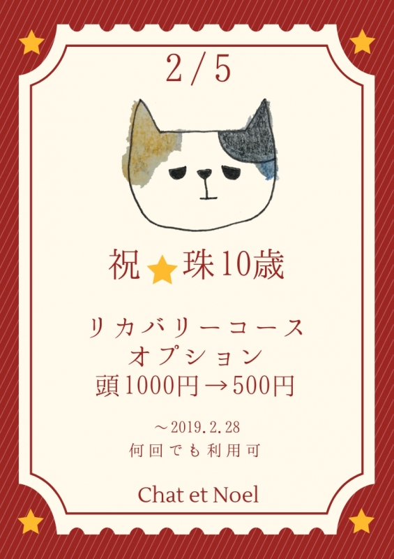 2/5は珠10歳の誕生日✨ ということで2月はお祝い気分のおすそわけとして 頭のリンパトリートメントを500円引き(5にちなんでみた)いたします! 頭も冷えるこの時期、ぜひお得にほぐしてあげてください💕 リラクシングプログラム リカバリーコースオプション 頭 1000円→500円 2019.2.28まで 何回でもご利用可能 ご予約の際にお申込みください。 ※サンクスプログラム特典(頭オプション無料)対象のお客様はお会計より500円引きさせて頂きます。 ...